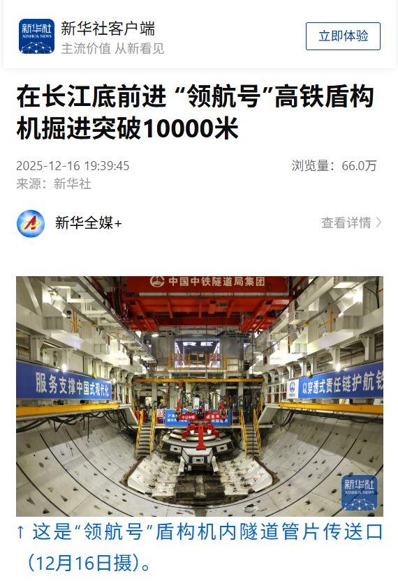 【央視新聞客戶端】世界最大直徑高鐵盾構(gòu)機“領(lǐng)航號”掘進突破萬米大關(guān)